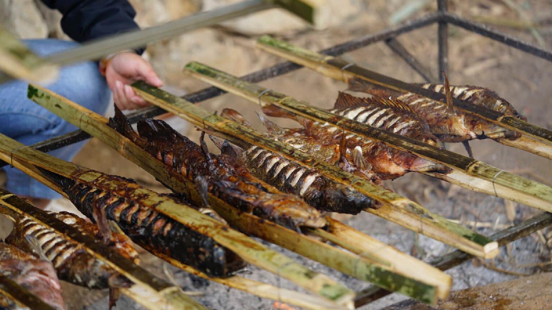 Cá nướng sông Đà Cá nướng sông Đà được xem là một trong những món ăn “nhất định phải thử” khi đến với Hòa Bình. Món ăn tuy được chế biến vô cùng đơn giản với những que tre kẹp cá nướng trên lửa nhưng vẫn để lại ấn tượng bởi từng thớ cá chắc ngọt, được tẩm ướp vừa miệng với phần da giòn, hơi xém cạnh. Khi thưởng thức, bạn có thể cuộn cá trong lá lốt để tăng thêm vị đậm đà của món ăn.
